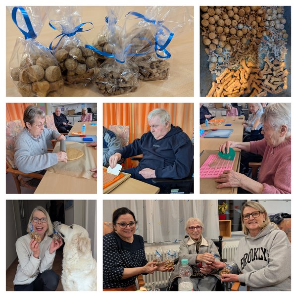 Im Teig wurden zwar nur natürliche Zutaten wie beispielsweise Leberwurst, Thunfisch und Parmesan verarbeitet, doch waren es ungewohnte Geruchserlebnisse, die durchs Haus zogen. Vor allem Mila, der Hund der Hausleiterin Jenny, war begeistert und kam gleich in den Genuss als „Vorkosterin“. Der Einsatz hat sich gelohnt: Beim Treffen für die Jahresplanung der Hundebesuche überreichte Heimbeirätin Renate Berger feierlich die Leckerli-Tüten. Als ehemalige Hundebesitzerin tauschte sie sich mit den ehrenamtlich Engagierten zur Hundeernährung aus. Cordula, Melli und Sabine waren sichtlich gerührt, dass sich die Bewohner*innen so sehr für ihre Hunde ins Zeug gelegt hatten. Auch die Hunde waren begeistert. So wie die Hunde den Bewohner*innen stets ein Lächeln ins Gesicht zaubern, so sahen jetzt die Hunde beim Genuss der Leckerlis sehr glücklich aus.