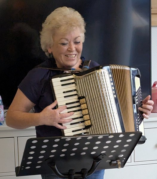 Sehr zur Freude der Bewohner*innen und Tagesgäste eröffnete Rosi Hertl mit dem schwäbischen Klassiker „Aufm Wasa graset d Hasa“ den Nachmittag im Haus im Park. Sie hatte nicht nur ihr Akkordeon mitgebracht, sondern auch ihr schwäbisches beziehungsweise eigentlich ihr „Dettenhäuser Schwäbisch-Hochdeutsch-Wörterbuch“. Selbst die eingefleischtesten Schwaben lernten an diesem Nachmittag noch neue schwäbische Wörter und einiges mehr hinzu. Alle rieten lachend bei den „Übersetzungen“ mit, erfreuten sich an bekannten schwäbischen Redensarten wie „Send Henna henna?“ und sangen schwäbische Lieder mit. Davon inspiriert gab ein „neigschmeckter Schwoab“ und Bewohner zur Freude aller noch ein paar Sätze auf Sächsisch zum Besten.