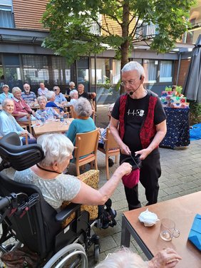 Zum Sommerfest am 25. Juni konnte Hausleiter Hans-Peter Besteck neben den Bewohnerinnen und Bewohnern auch Gäste aus dem betreuten Wohnen und die Nachbarschaft des Christiane-von-Kölle-Stifts begrüßen. So saßen bei schönstem Wetter gut 60 Menschen an den festlich gedeckten Tischen und ließen es sich bei Erdbeerbowle, Kaffee und Kuchen gut gehen. Für Unterhaltung sorgte der Zauberer Fedor. Auch er benötigte immer wieder „Assistentinnen“ für seine Tricks und band die Gäste mit viel Humor ein.