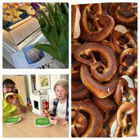 Ohne frische Backwaren wäre das Frühstück oder Abendessen im Samariterstift nicht das, was es ist. Seit vielen Jahren beliefert die Bäckerei Euper aus Entringen das Pflegehaus jeden Tag mit frischem Brot und öfters auch mit süßen Teilchen zum Mittagskaffee. Doch vor kurzem überraschte die Inhaberin Kathrin Euper-Stöckler die Bewohnerinnen und Bewohner mit einer außerplanmäßigen Lieferung von 60 Brezeln zum Abendbrot. Die Brezeln waren als Spende zur Osterzeit gedacht. Dafür wollten die Bewohnerinnen und Bewohner Danke sagen: Eine kleine Abordnung aus dem Haus überreichte Kathrin Euper-Stöckler einen schönen Blumenstrauß als Dankeschön.