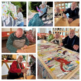 Die Bewohnerinnen und Bewohner des Haus im Park bringen gerne gemeinsam Farbe ins Pflegehaus in Dettenhausen. Bei einer kreativen Aktion "Action Painting" hatten im vergangenen Sommer Bewohnerinnen und Bewohner im Garten auf ein großes weißes Bettlaken Farbe gekleckst, gesprüht und mit Ästen und Pflanzen gewischt. Leider war das Kunstwerk zu groß, um es im Haus aufzuhängen. Also wurden nun mehrere kleinere Leinwände daraus gemacht und auf Rahmen aufgezogen, um so das Kunstwerk ausstellen zu können. Die besten Ausschnitte zu finden, war gar nicht so einfach, und es wurde intensiv diskutiert. Hier einige Stimmen: „Also der Esel da in der Mitte, der muss es sein." „Nein, das ist ein Steinbock." "Den Rahmen noch ein bisschen nach links bitte." „Es muss nichts darstellen, es muss nur gut aussehen." Mit vereinten Kräften gelang es, nicht nur die Rahmen zusammenzubauen, sondern auch schöne Ausschnitte zu finden. Und bald geht’s weiter...