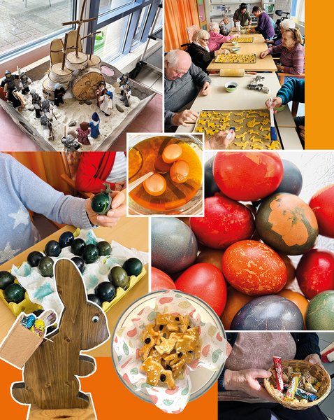 Es wurde gebacken, dekoriert, die Osterkrippe aufgebaut, und natürlich Ostereier gefärbt – dabei gab es tatkräftige Unterstützung von der Familie einer Bewohnerin. Die bunt gefärbten, teilweise sogar mit Blätter- und Blütenmuster verzierten Ostereier konnten sich wirklich sehen lassen.