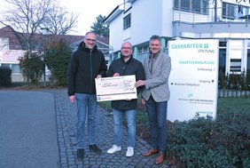 Die beiden Geschäftsführer von F.K. Systembau Frank Bechle (links) und Ewald Schmauder (rechts) überreichen Hanspeter Brodbeck, Vorstandsvorsitzender der Samariterstiftung, den symbolischen Spendenscheck.