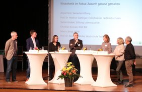 Bildunterschrift: Christian Konrad (AOK) (von links), Marco Stingl (BGW), Prof. Astrid Elsbernd (Hochschule Esslingen), Prof. Reinhold Wolke (Hochschule Esslingen), Prof. Heidrun Gattinger (Fachhochschule Ostschweiz), Anna Fürst (Samariterstiftung) und Stefan Knobel (Stiftung Lebensqualität) diskutierten beim Fachtag über Erfolgsfaktoren für Kinästhetik-Projekte und deren Chancen für soziale Träger.